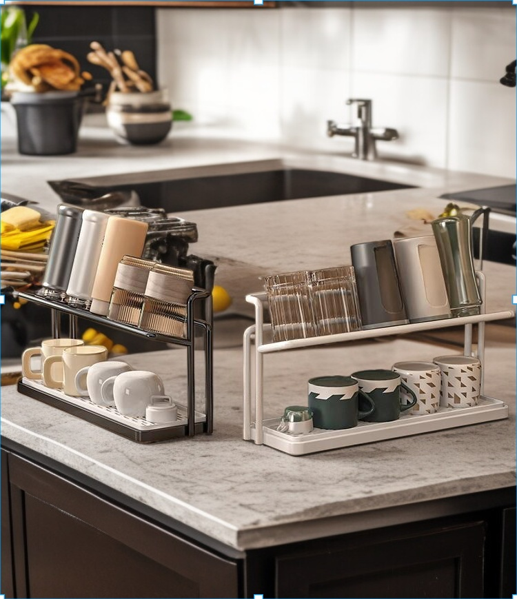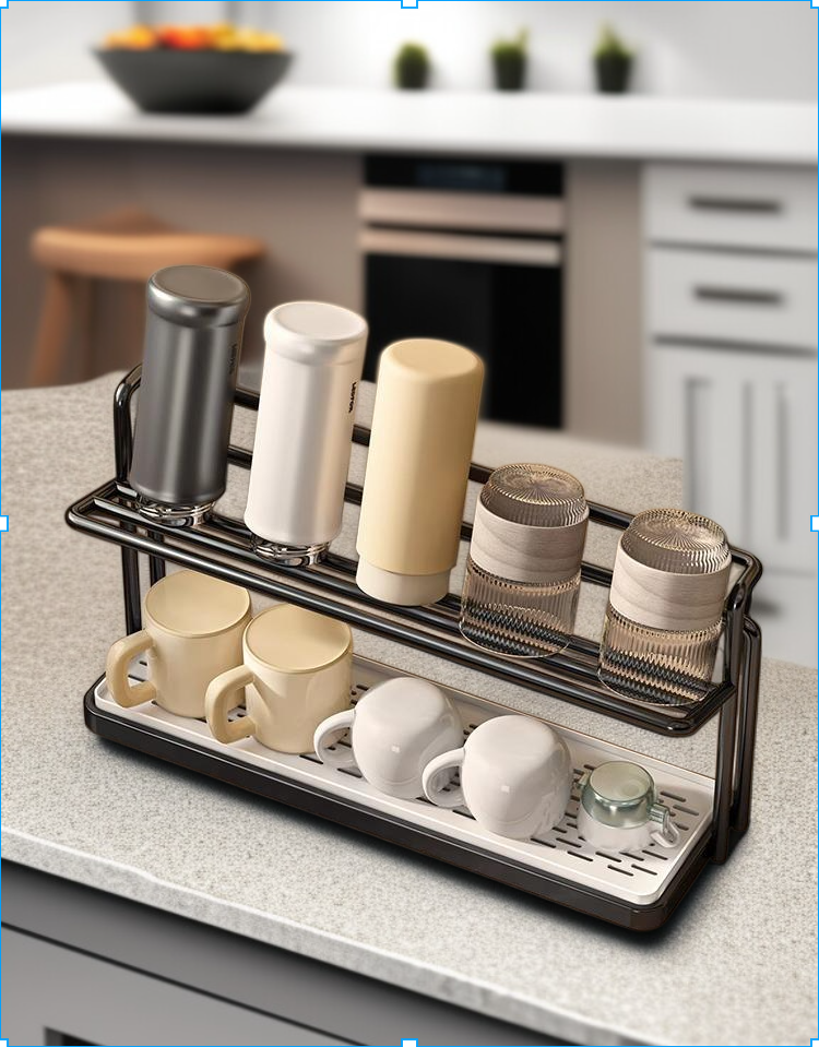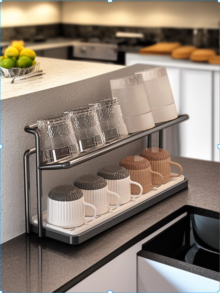 Double-layer cup rack for kitchen countertop, organized water cup storage, space-saving design, detachable drain tray, durable material, easy to clean, suitable for home and office use.